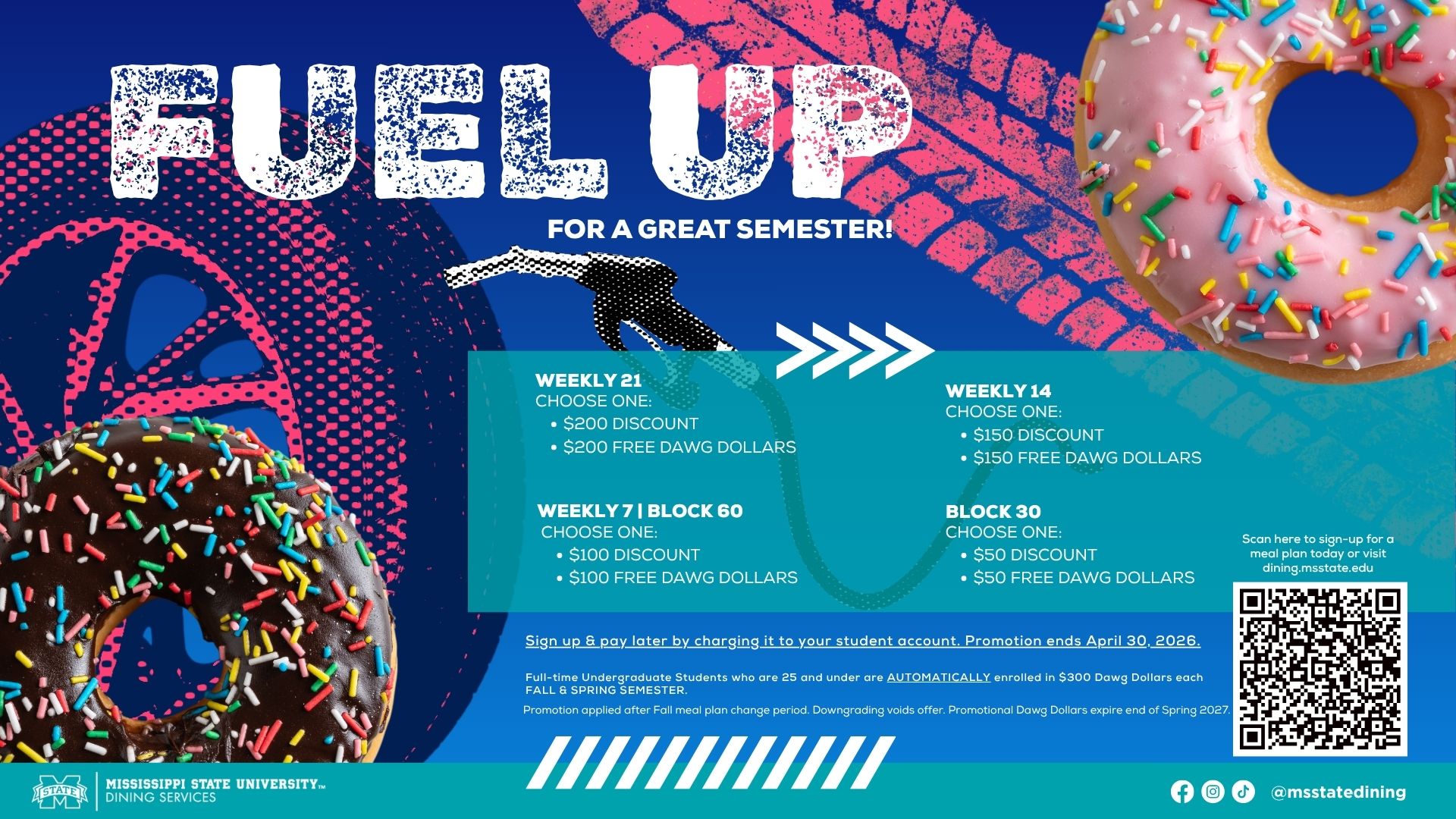 This promotion is available to Mississippi State University students who are eligible to purchase a qualifying meal plan for the Fall 2026 and Spring 2027 academic year. All meal plans are subject to Mississippi State University Dining Services policies. - Promotion Period